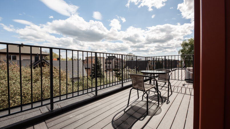 Bute rasite svetainę su pilnai įrengta modernia virtuve. Virtuvėje rasite visą reikiamą įrangą, indus bei įrankius maisto gamybai. Du atskiri miegamieji antrame aukšte suteikia privatumą ir komfortą, o du šiuolaikiški vonios kambariai ypač praverčia ilgiau apsistojantiems svečiams. Didelė privati terasa su lauko baldais kviečia pradėti rytą su kava gryname ore, praleisti jaukius vakarus ar tiesiog atsipalaiduoti nuo dienos rūpesčių. Bute taip pat yra greitas bevielis internetas, du televizoriai, indaplovė, skalbimo mašina su džiovykle bei visi kiti patogumai maloniai viešnagei užtikrinti.