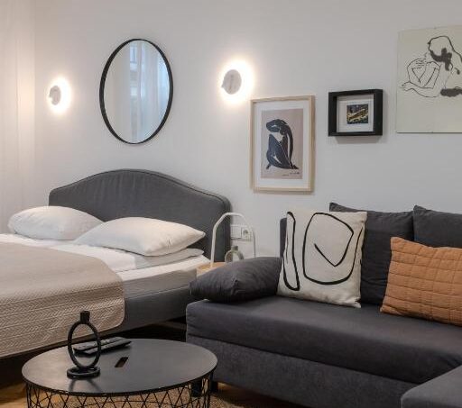 Studija moderni, gyva ir apgalvota iki smulkmenų – patogiai apsistos iki 3 svečių. Ramiam poilsiui paruošta patogi dvigulė lova, o sofa-lova puikiai tiks papildomam svečiui ar jaukiam vakarui. Virtuvė pilnai įrengta – nuo šaldytuvo iki indų ir maisto gaminimo reikmenų, tad ryto kava ar vakarienė „namuose“ bus be jokio vargo. Vonios kambaryje rasite dušą, švarius rankšluosčius, plaukų džiovintuvą ir būtiniausias higienos priemones.
